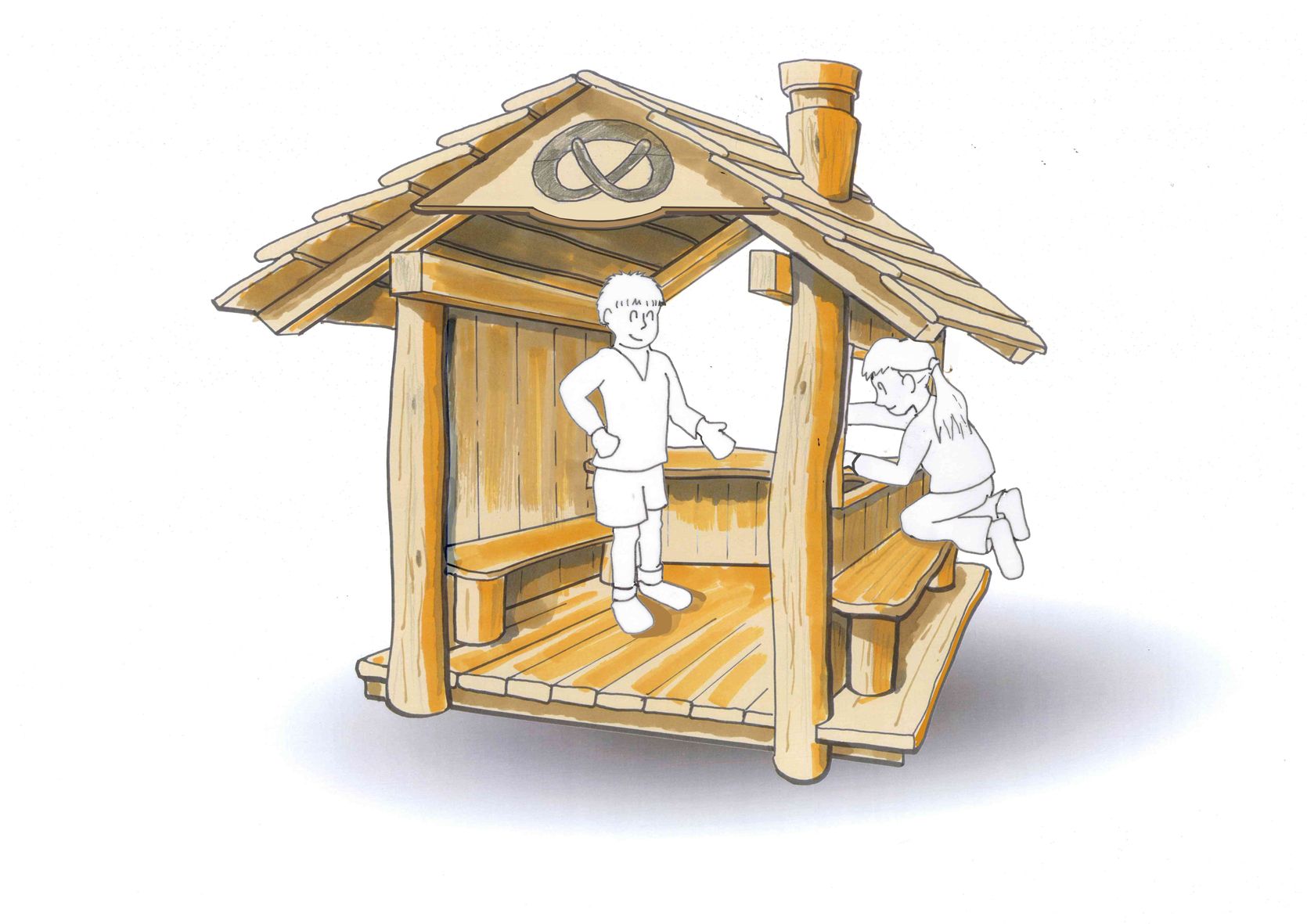 Die „Bäckerhütte“ bietet sich als Rückzugsbereich und für das Rollenspiel an. Mit ihrer Theke, den Fenstern und Bänken fördert die Hütte die Interaktion der Kinder. Das Motiv des Paneels kann nach Wunsch an andere Themen angepasst werden.