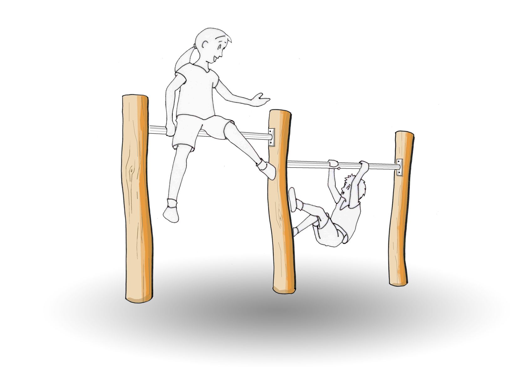 Das Doppelreck ist das universelle“Sport„ -gerät, das von den kleineren Kindern mit Elan beklettert wird und an dem die etwas Größeren Kunststücke üben.