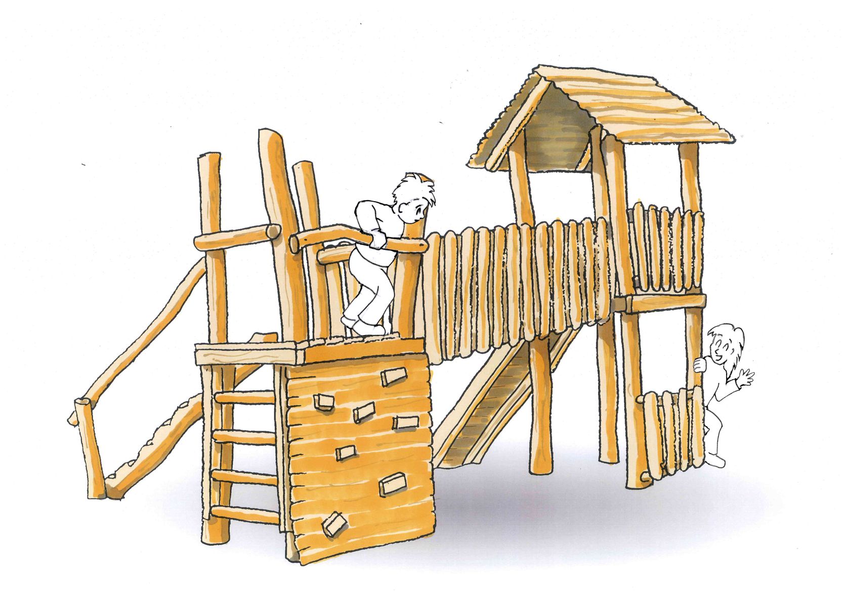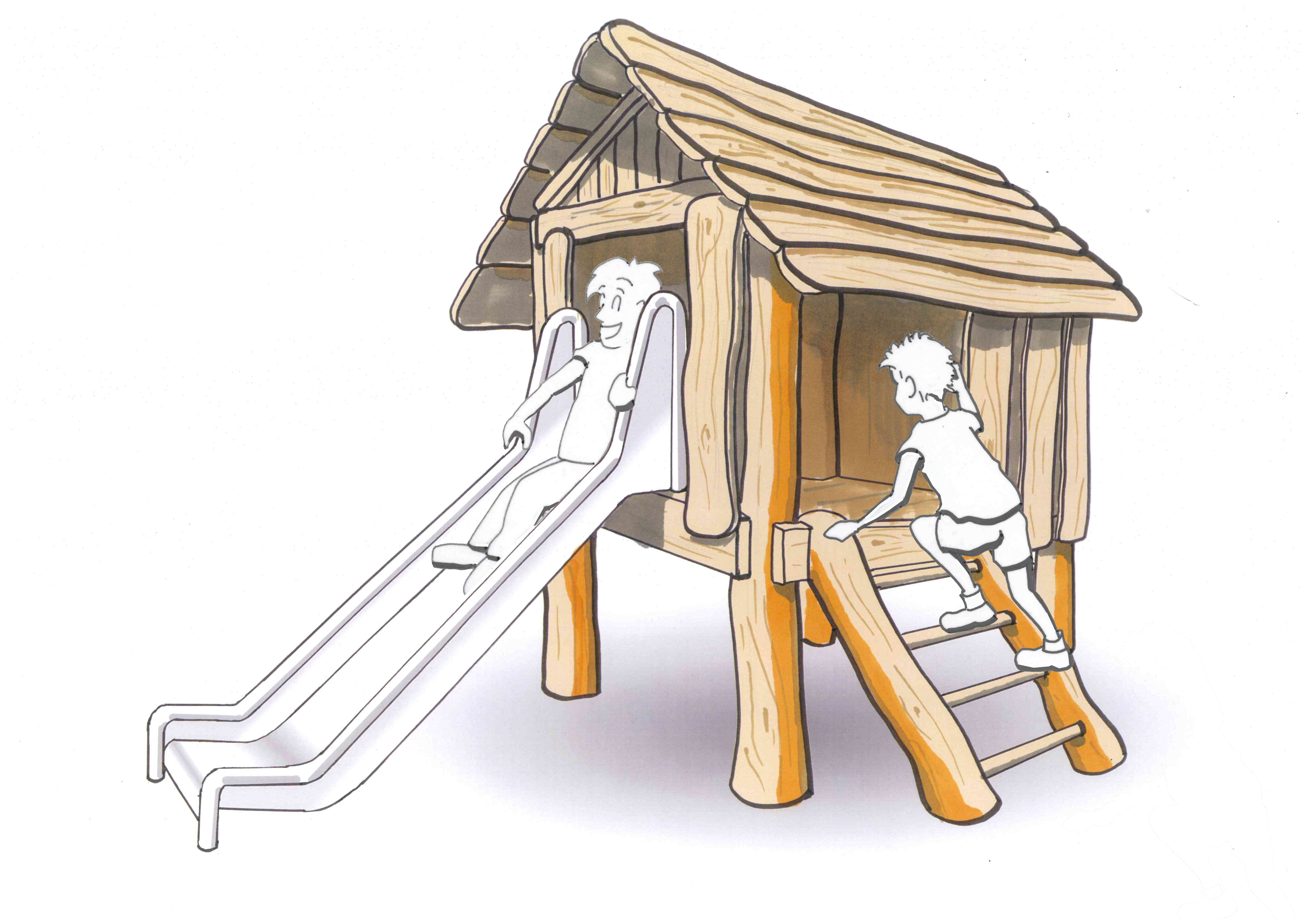 Die „Stelzenhütte“ bietet eine Mischung aus Rollen- und Bewegungsspieloptionen. Im hinteren Raum der Hütte können sich die Kinder zurückziehen, die Rutsche und der Aufstieg lassen einen Spielkreislauf zu.