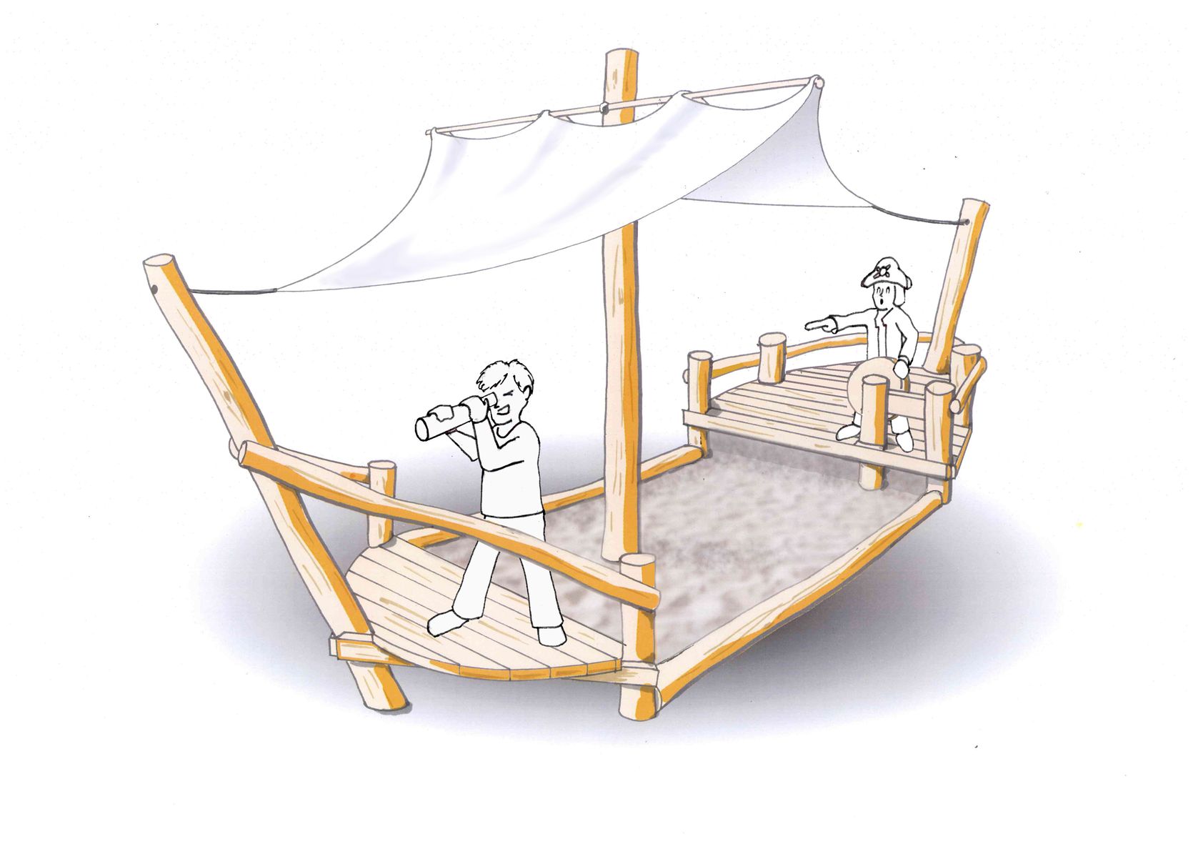 Das Sandschiff ist ein klassisches Rollenspielgerät. Auf Vorder- und Achterdeck werden die Weltmeere erobert, das Mitteldeck ist zugleich Sandkiste und wird von ebenerdig verlegten Stämmen eingefasst.