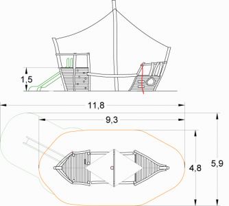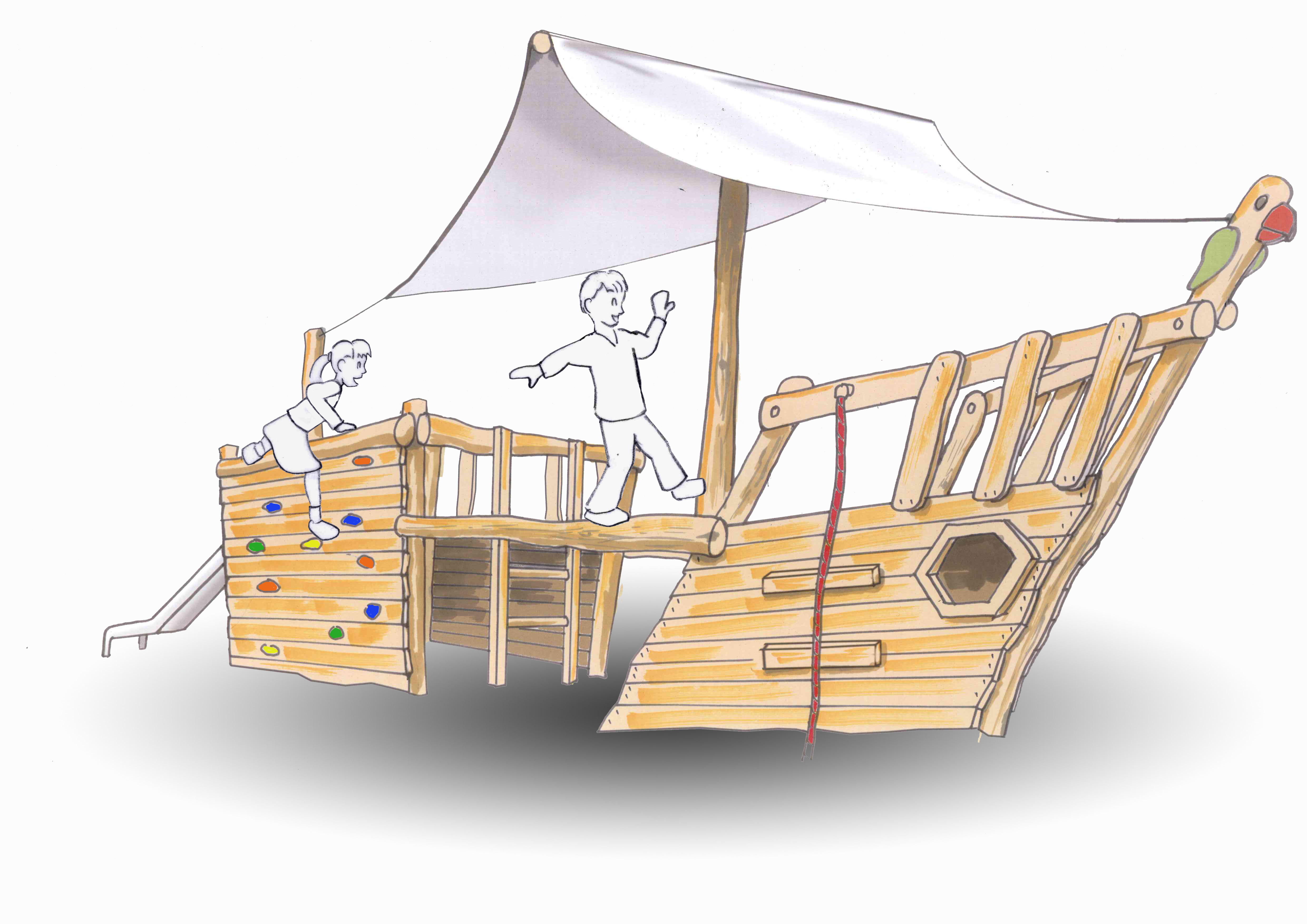 Die Kogge bietet maritimen Spielwert: - Boulder(bord-)wand - Anker(kletter-)tau - Balancierreling - Laderaum und Kajüte - Bullaugen - ... und auf Wunsch eine Rutsche